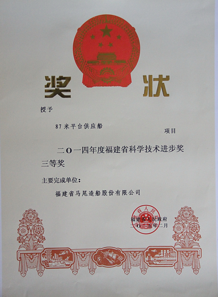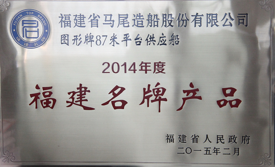 • 馬尾造船87米平臺供應船榮獲福建省人民政府2014 年度“福建名牌產品”