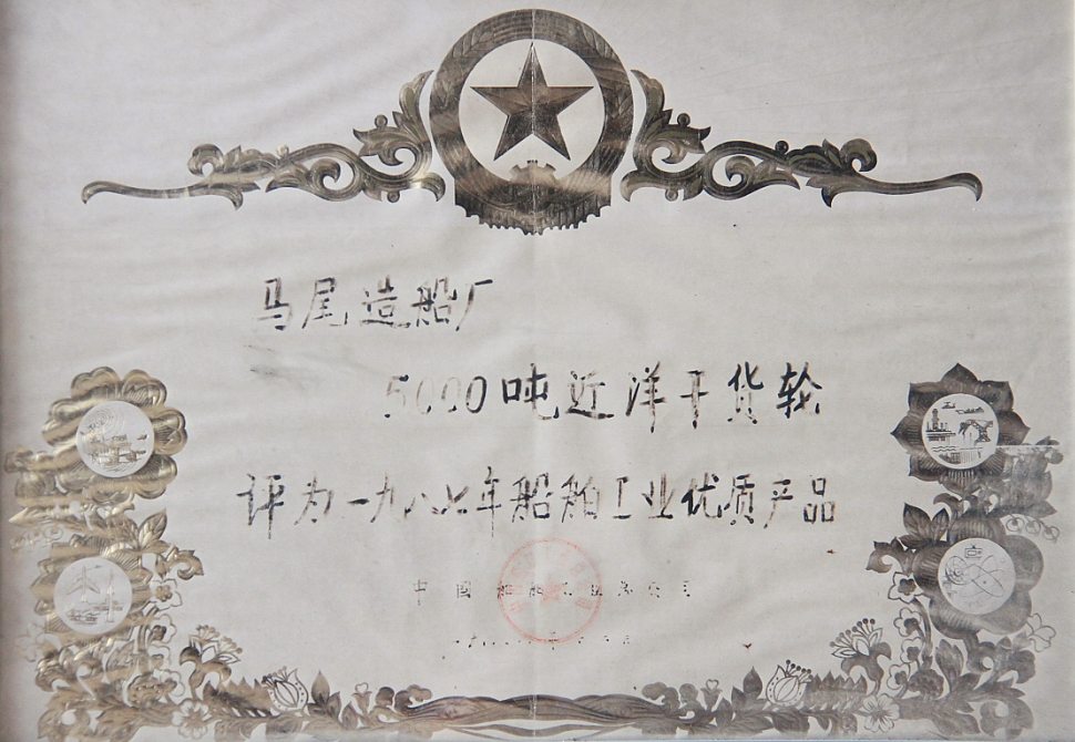 馬尾造船“紅旗154 號”5000 噸近洋干貨輪獲中國船舶工業總公司授予的“一九八七年船舶工業優質產品”稱號