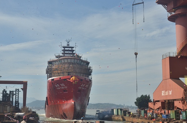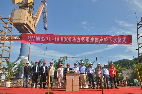 2015年11月13日12:00,馬尾造船股份有限公司為中石化海洋石油工程有限公司(原名:上海海洋石油勘探開發(fā)總公司)承造的8000馬力多用途供應(yīng)船(VMW627L-1)在1.5萬噸船臺順利下水。中石化海洋石油工程有限公司代表、CCS船檢、海事局、馬尾造船公司領(lǐng)導(dǎo)出席下水儀式。